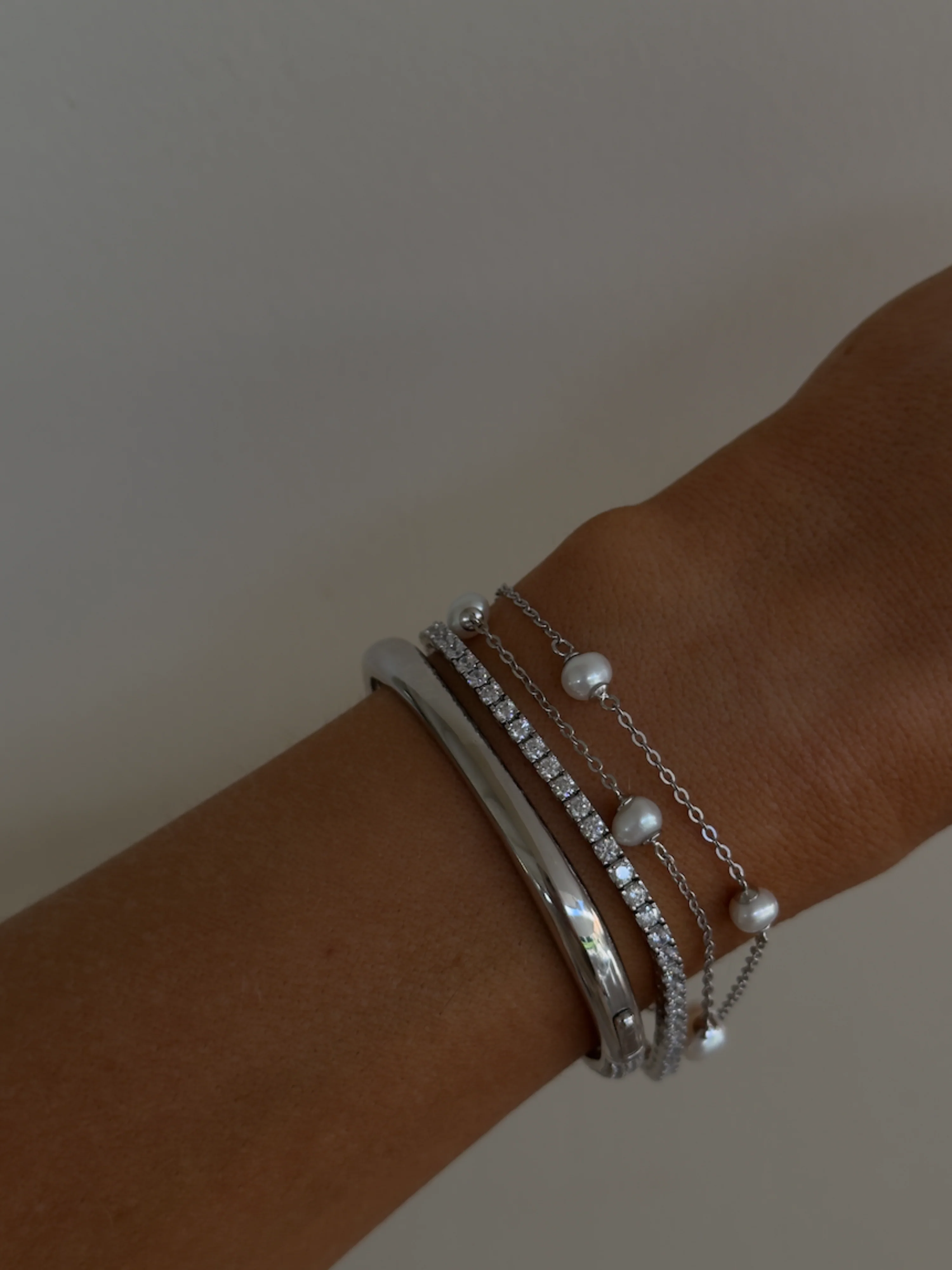 Our Sophia Freshwater Pearl Bracelet brings timeless beauty with a contemporary edge. Lustrous freshwater pearls gently rest along a refined white gold-plated chain, creating a soft glow that wraps the wrist in quiet luxury.